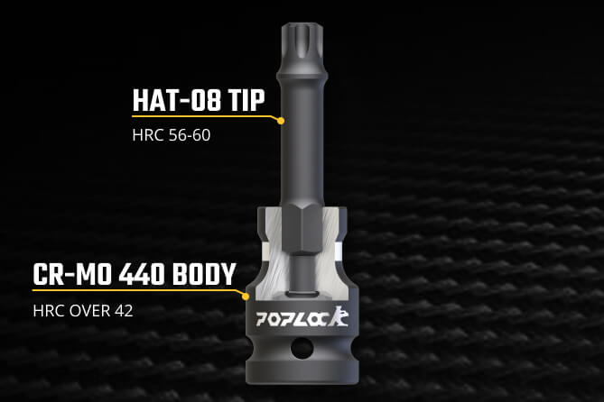 Poplock solves this with a dual-alloy design: an ultra-hard HAT-08 tip that keeps its shape and a tough Cr-Mo 440 body that flexes to handle repeated impact. Each material performs where it’s strongest, giving the tool lasting strength and resilience.
